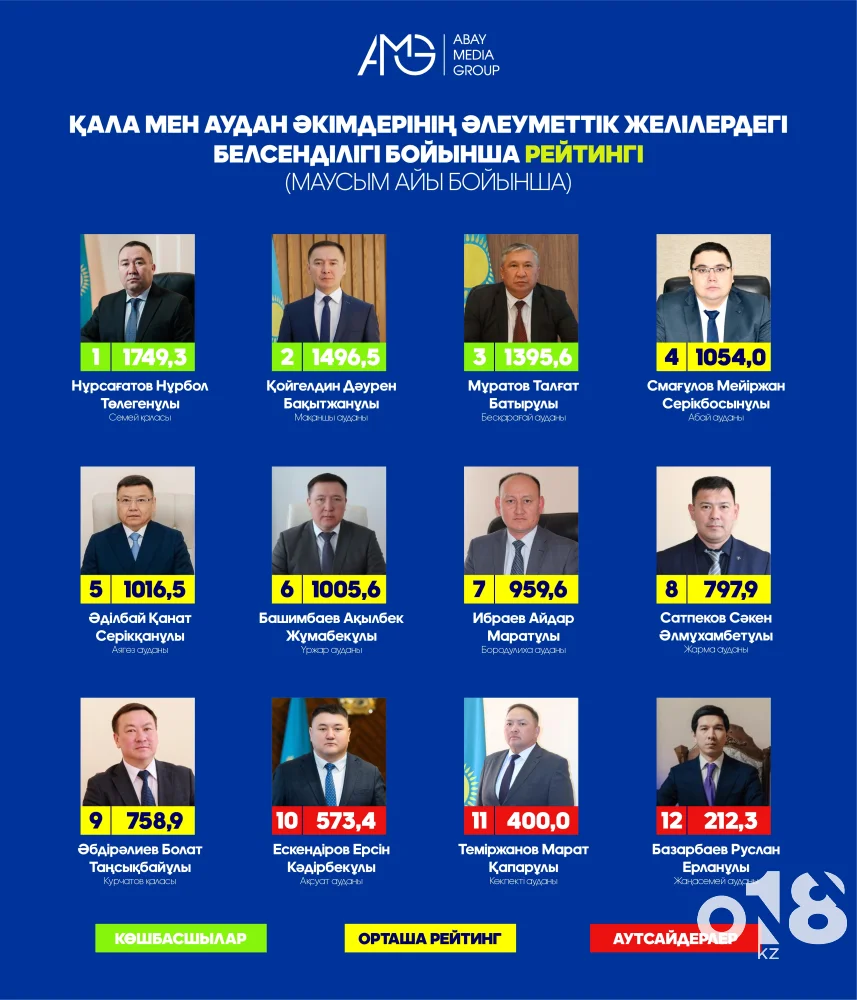 Бұл әрбір шенеунік әлеуметтік желілерде белсенді болуы керек дегенді білдіреді. Президенттің тапсырмасын назарға ала отырып, Абай облысындағы қала мен аудан әкімдерінің әлеуметтік желілердегі белсенділігінің рейтингі шығарылды. Аталмыш рейтингті «Abay Media Group» ЖШС қарасты ақпараттық-аналитика бөлімінің мамандары дайындады. Рейтинг аудан әкімі мен әкімдіктердің әлеуметтік желідегі белсенділіктері бойынша арнайы әзірленген критерийлер формуласы бойынша есептелді.
