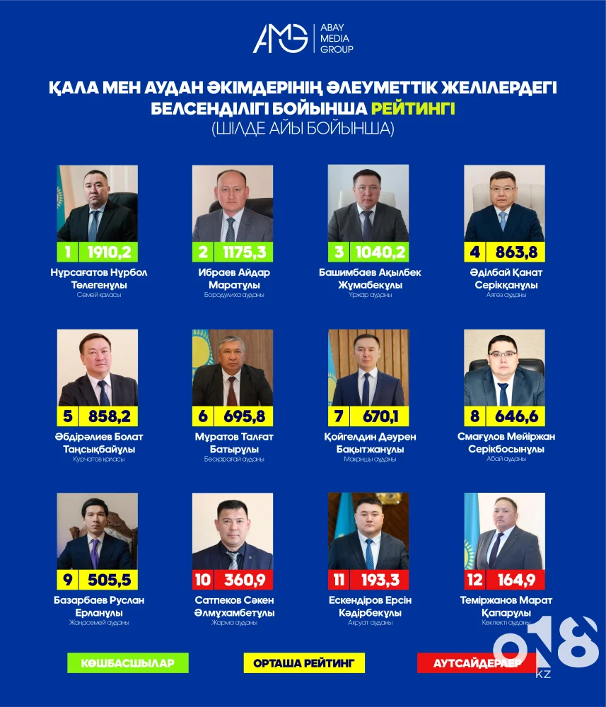 Бұл әрбір шенеунік әлеуметтік желілерде белсенді болуы керек дегенді білдіреді. Президенттің тапсырмасын назарға ала отырып, Абай облысындағы қала мен аудан әкімдерінің әлеуметтік желілердегі белсенділігінің рейтингі шығарылды. Аталмыш рейтингті «Abay Media Group» ЖШС қарасты ақпараттық-аналитика бөлімінің мамандары дайындады. Рейтинг аудан әкімі мен әкімдіктердің әлеуметтік желідегі белсенділіктері бойынша арнайы әзірленген критерийлер формуласы бойынша есептелді.
