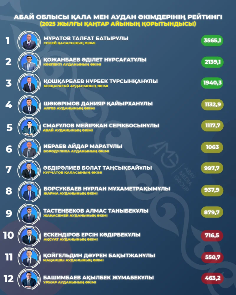 АБАЙ ОБЛЫСЫ ҚАЛА МЕН АУДАН ӘКІМДЕРІНІҢ РЕЙТИНГІ (ҚАҢТАР АЙЫНЫҢ ҚОРЫТЫНДЫСЫ)