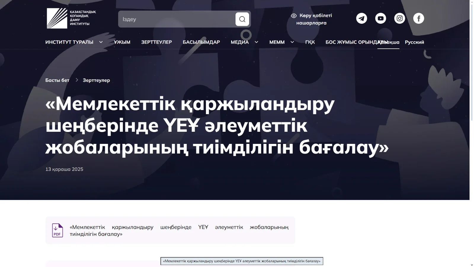 ҚР Мәдениет және ақпарат министрлігінің тапсырысы бойынша Қазақстан қоғамдық даму институты ҮЕҰ әлеуметтік жобаларының тиімділігін бағалауға арналған әлеуметтік зерттеу жүргізді.
