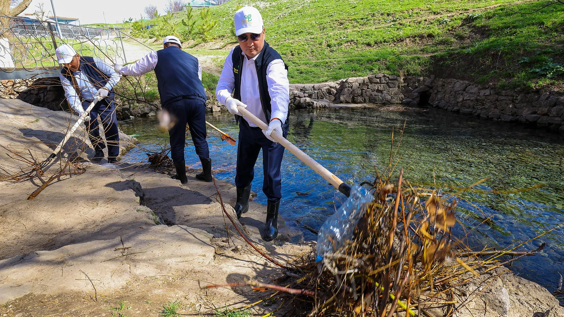 Премьер-министр Олжас Бектенов Президенттің «Таза Қазақстан» бастамасы аясында Түркістан облысы Сайрам ауданы Ақбұлақ ауылындағы «Ақ-Ата» бұлағын тазарту және абаттандыру іс-шараларына қатысты.