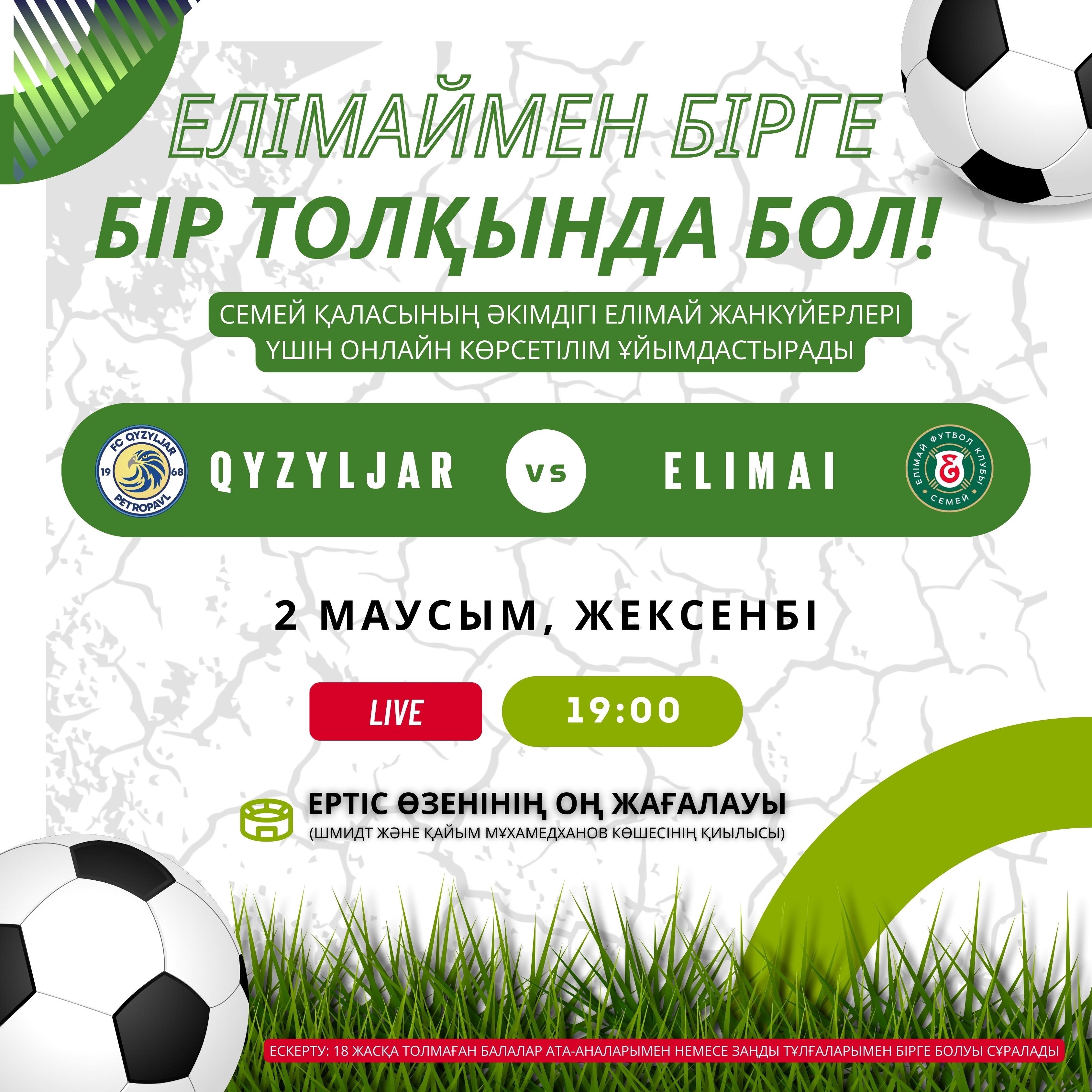 Акимат города Семей организует онлайн-трансляцию этого матча для болельщиков ФК «Елимай» на правом берегу реки Иртыш.