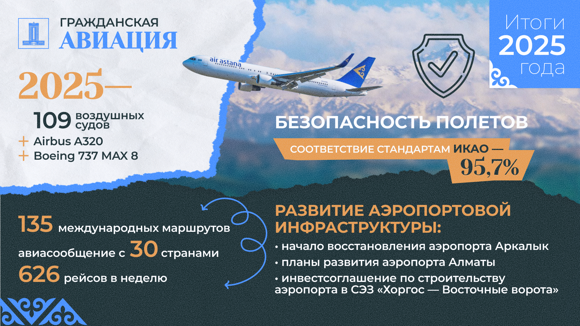 Важным шагом стало принятие Концепции развития гражданской беспилотной авиации Республики Казахстан на 2025–2031 годы. Кроме того, на рынок страны вышел ряд новых низкобюджетных авиакомпаний, а также открыто более 35 новых международных маршрутов, включая рейсы в Будапешт, Шанхай, Сеул, Гуанчжоу и Мюнхен.