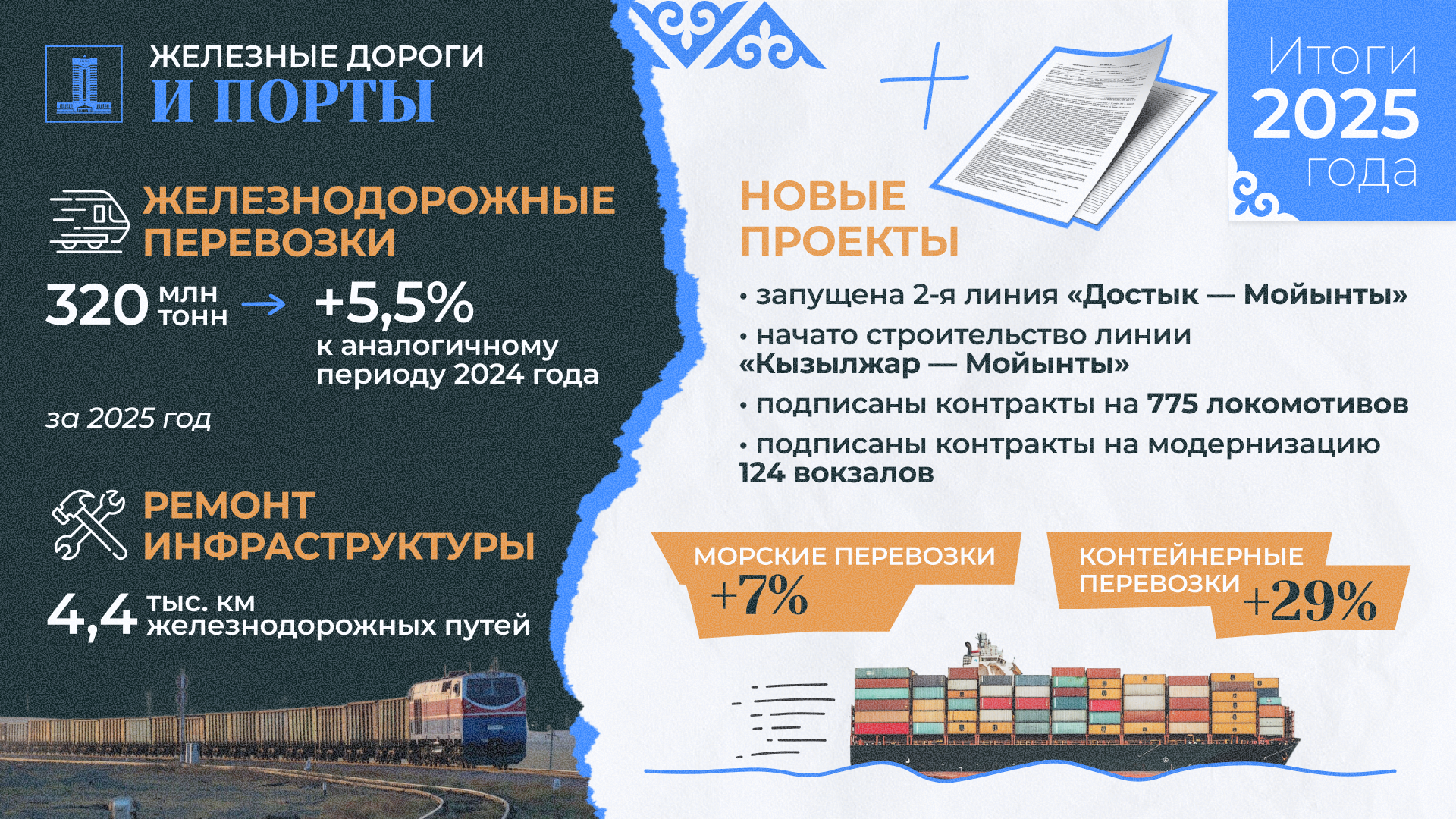 К числу ключевых событий 2025 года относится запуск второй линии железной дороги «Достык – Мойынты» протяженностью 836 км, а также начало строительства новой линии «Кызылжар – Мойынты» длиной 323 км. Подписаны контракты на поставку 775 локомотивов и 2,7 тыс. фитинговых платформ. Начата модернизация 124 железнодорожных вокзалов по всей стране.