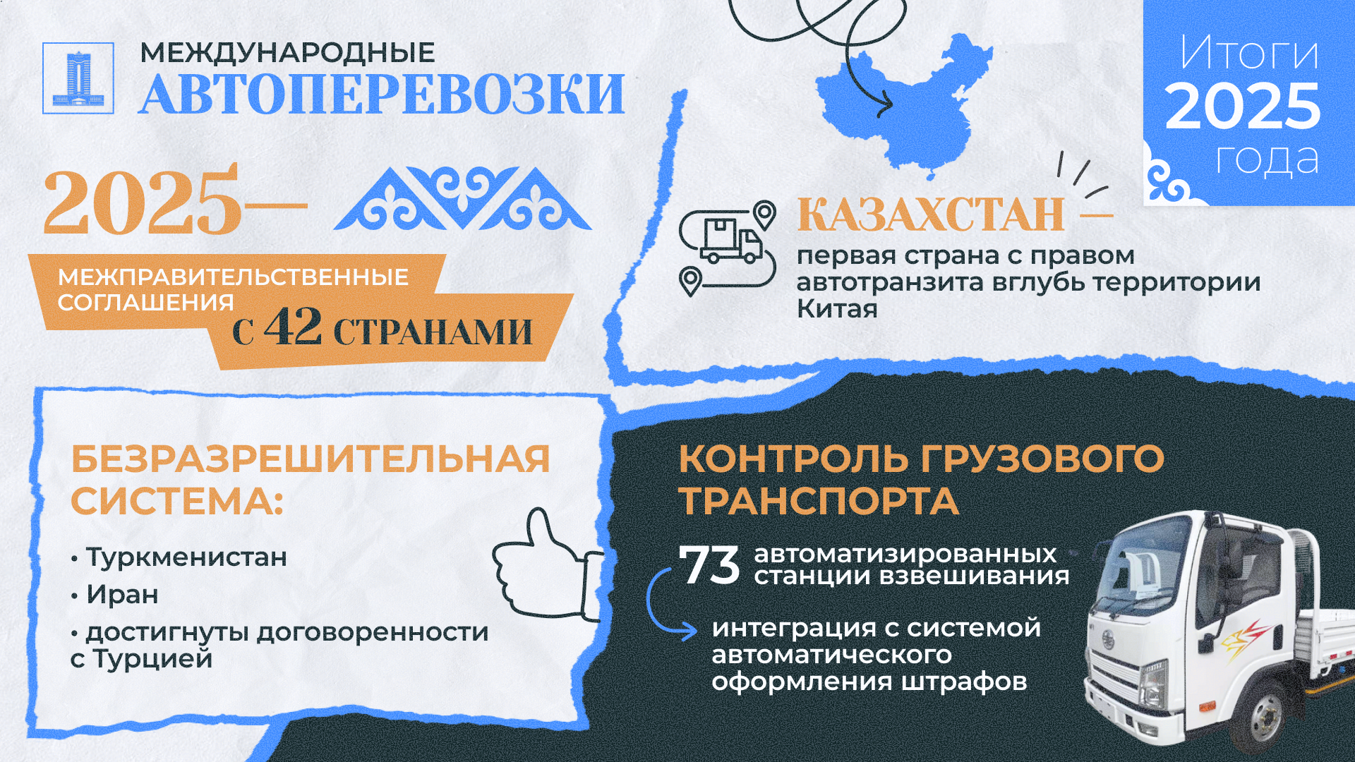 В 2025 году была продолжена работа по расширению географии международных автомобильных перевозок. Казахстан заключил межправительственные соглашения с 42 странами, с которыми осуществляется ежегодный обмен квотами иностранных бланков разрешений. Внедрена безразрешительная система перевозок с Туркменистаном, а также на двусторонние и транзитные перевозки с Ираном. Достигнута договоренность с Турцией. Казахстан стал первой страной, получившей право осуществлять транзитные автоперевозки вглубь территории Китая.