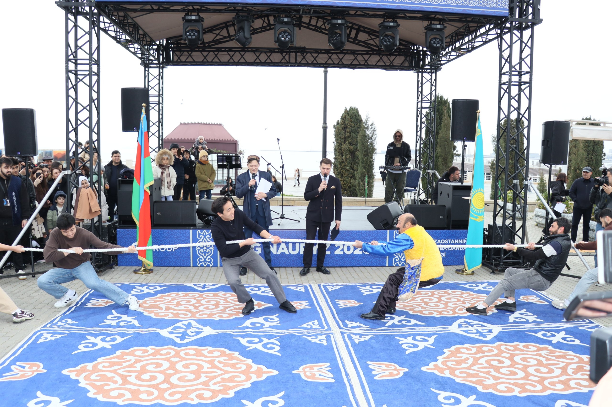 Интерактивная часть включала в себя познавательные конкурсы на знание общих корней казахского и азербайджанского языков, а также национальные спортивные состязания – «арқан тарту» и «асық ату».