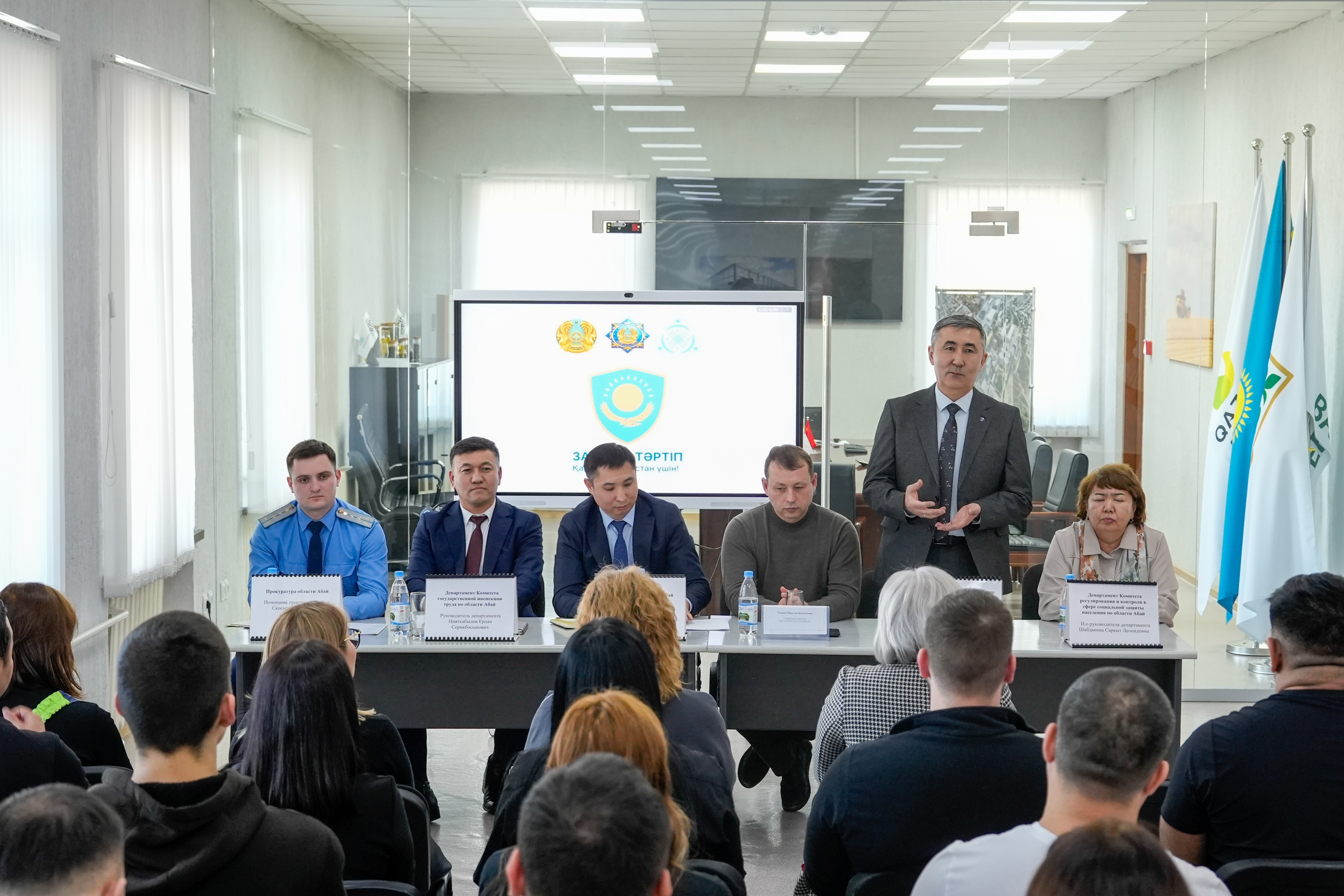 В рамках реализации принципа «Закон и порядок» прокуратура области Абай совместно с органами государственной инспекции труда, департаментом социальной защиты, а также объединением профсоюзов области провела встречи с трудовыми коллективами ТОО «Qazaq Astyq Group» и ТОО «ПК «Цементный завод Семей».